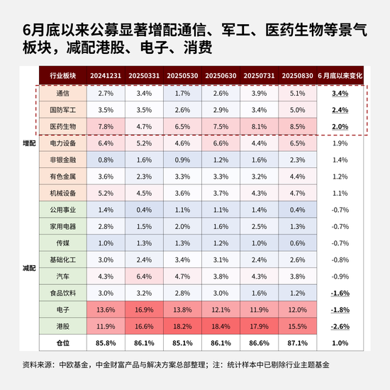 从公募基金近期调仓轨迹也能验证上述趋势。6月底以来,通信、军工、医药生物等景气板块获加仓更多,而港股、电子、食品饮料则被明显减配。