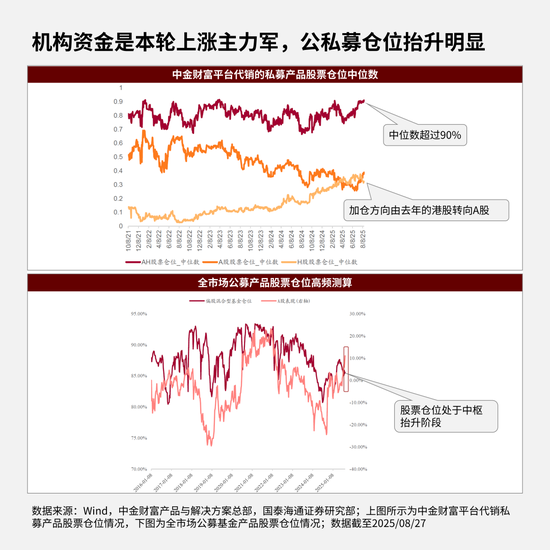 中金财富平台代销私募产品的股票仓位中位数已超过90%,较去年有明显系统性抬升,且加仓方向从去年到今年从港股转向了A股;公募基金的股票仓位始终处于中枢抬升阶段,偏股混合型基金仓位持续高位运行。