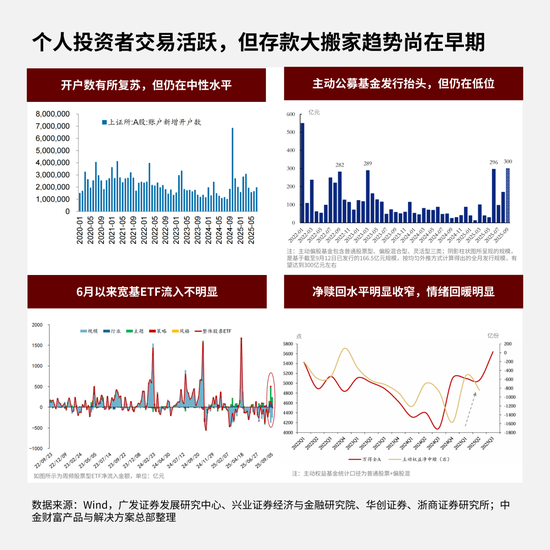 而反观个人投资者,虽然交易活跃度有所提升,但从新开户数、宽基ETF流入、主动型公募基金发行等指标看,总体还远没达到火热状态。融资买入额与成交金额的比值虽然近期有所攀升,但距离历史高位水平尚有距离,说明杠杆资金并未过热。