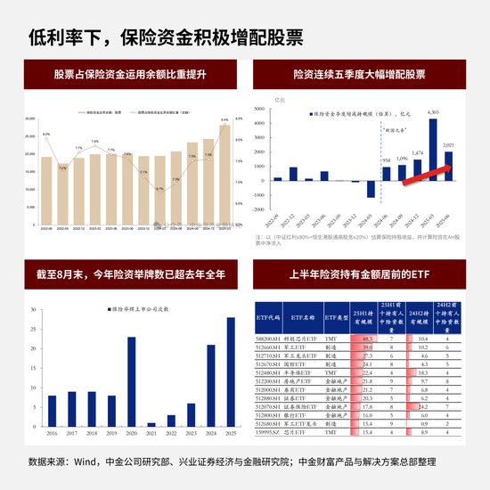 再看保险资金,今年以来,在低利率趋势下,保险资金在积极增配股票。从股票占保险资金运用余额的比例看,从去年6、7月份开始正持续抬升。除了分红型股票,还大举买入如创芯片ETF、军工ETF等间接入市。此外,还有一些银行理财子也有边际加仓动作。