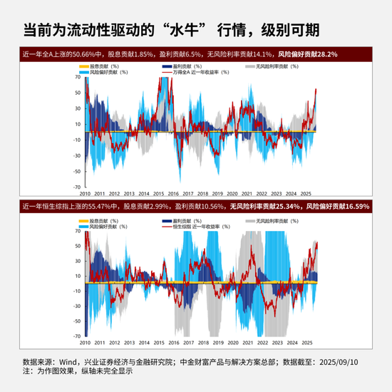 拆解行情贡献,近一年推动A股、港股上涨,主要靠风险偏好抬升与无风险利率下行带来的估值抬升贡献的,盈利贡献尚在初期,侧面说明当前市场仍处于“水牛”阶段,行情由资金面和情绪面主导。